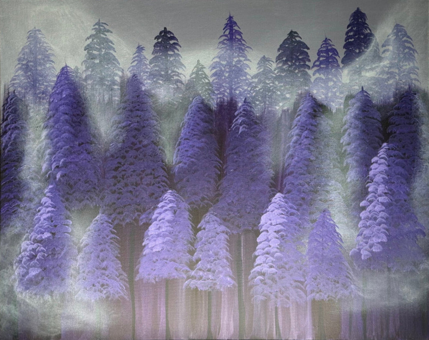 Violet shadows stretch through the trees, where fading light and drifting mist blur like watercolor in the dusk. A forest alive with depth, softness, and shifting color.